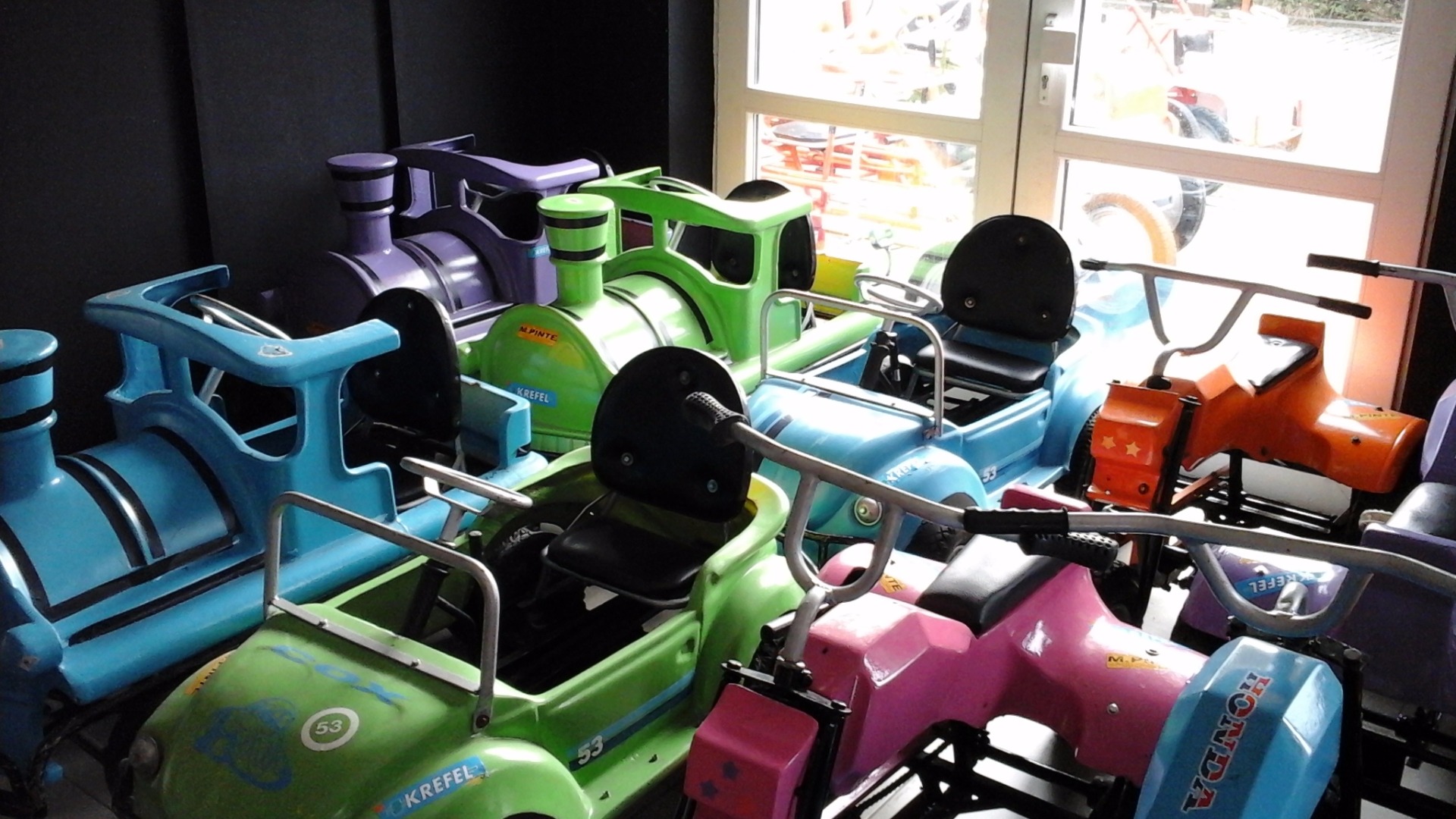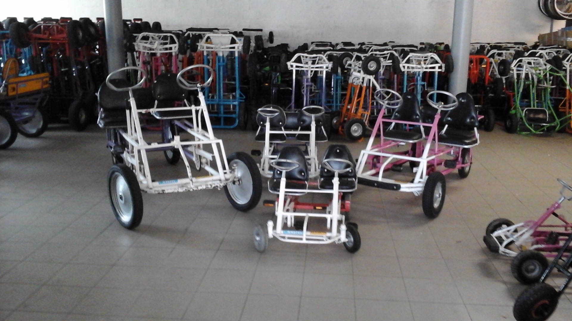 DEZE VOERTUIGEN WORDEN AANGEDREVEN DOOR EEN BATTERY DUS LEKKER GEMAKKELIJK. HIER HOEF JE NIET TE TRAPPEN. ZE RIJDEN ONGEVEER AAN EEN SNELHEID VAN 5KM PER UUR DUS WANDELSNELHEID WAT DIT VEILIG MAAKT. AANGEZIEN DEZE NIET SNEL RIJDEN LATEN WIJ ER ENKEL KINDEREN TUSSEN 5 EN 10 JAAR OUD MEE RIJDEN